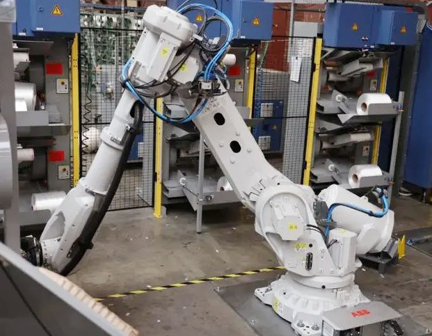 This series of robot is suitable for palletizing industry. Max.Range is 3195mm. If your pallet size is 1000mm*1200mm,the robot can cover up to 6 pallets. Just like simulation describes. The other advantage is robot cycle time. Up to stacking 800 bags one hour. So if your application is palletizing. We suggest you select this series robot. |
