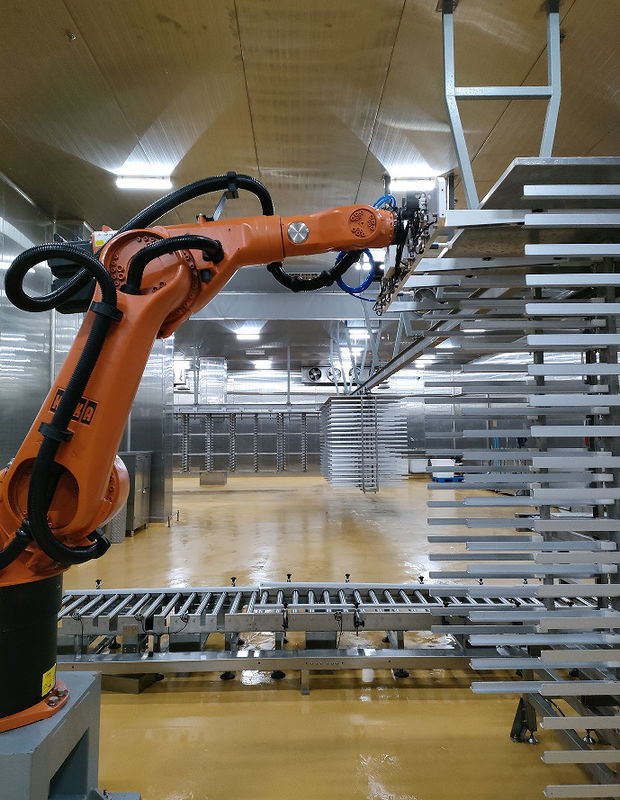 বাল্ক খাদ্য হ্যান্ডলিং: কৃষির মতো সেক্টরে, রোবট বাল্ক আইটেম প্যালেটাইজ করতে পারে, যেমন ডিমের ট্রে স্ট্যাকিং। KUKA রোবটগুলি তাদের ভঙ্গুর পণ্যগুলির মৃদু হ্যান্ডলিংয়ের জন্য পরিচিত, যা ন্যূনতম ভাঙন নিশ্চিত করে।